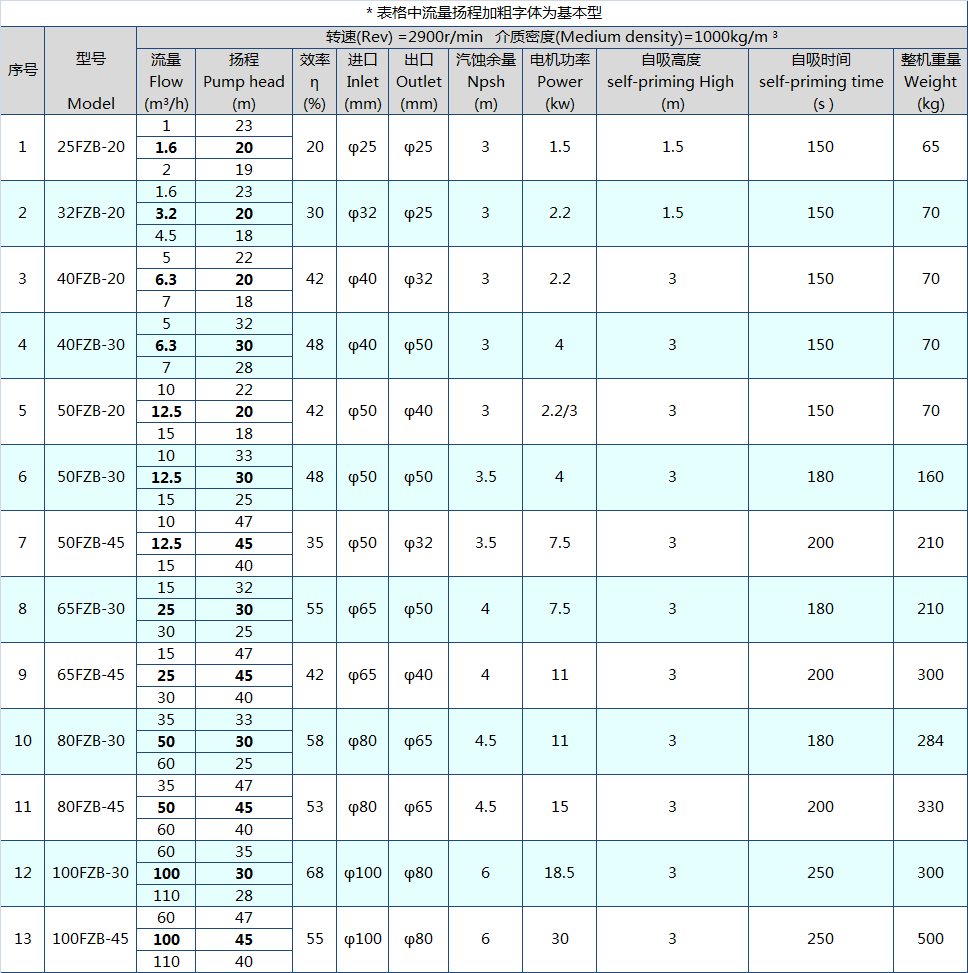 例:50FZB-2550-吸入口直径(mm)FZ-过流部件为氟塑料制造B-单级单吸悬臂式离心泵25-扬程(m)